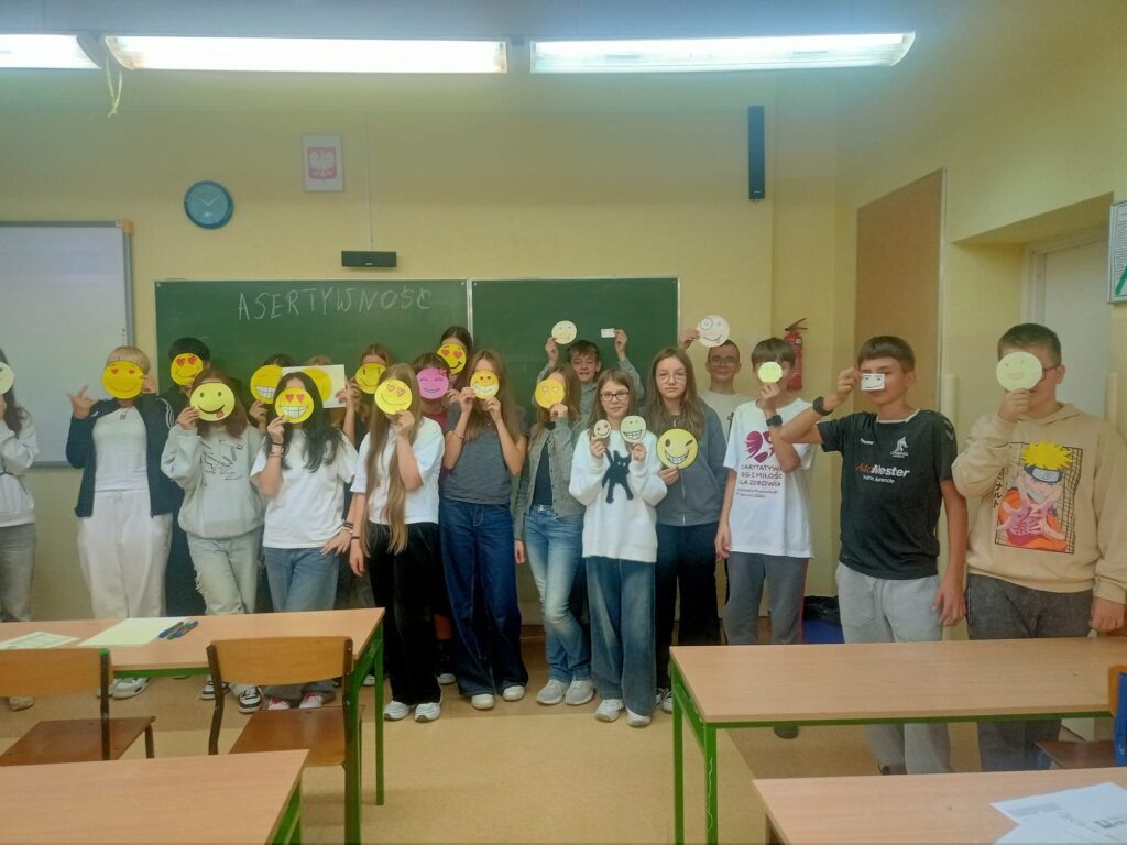 Przeprowadzenie zajęć w klasie 7a na temat: Sztuka dialogu i rozwiązywania konfliktów rówieśniczych. Odegranie scenek – jak zachowywać się asertywnie. Praca w grupach – jakie podejmować działania w sytuacjach przemocowych.