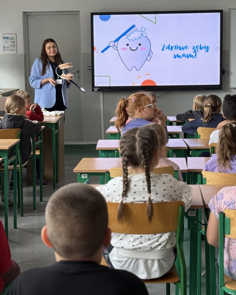 Podczas spotkania dzieci dowiedziały się, jak prawidłowo myć zęby, jak ważna jest zdrowa dieta oraz regularne wizyty u dentysty. Zajęcia przebiegły w miłej atmosferze, a uczniowie z dużym zaangażowaniem uczestniczyli w rozmowach i zabawach edukacyjnych.