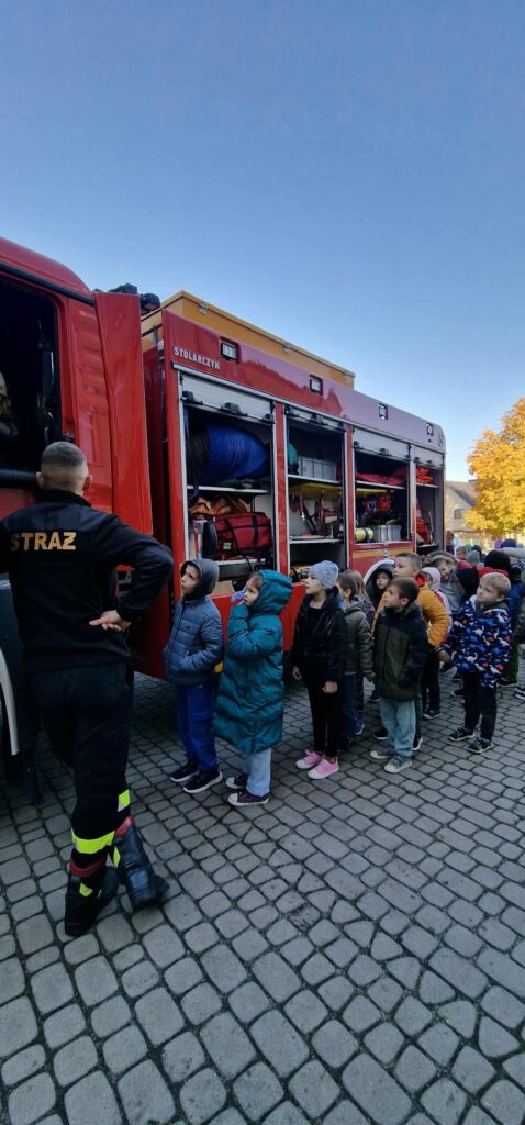 Po zakończeniu próbnej ewakuacji dzieci z grupy przedszkolnej „0” oraz uczniowie klas pierwszych mogli obejrzeć wóz strażacki i jego wyposażenie.
