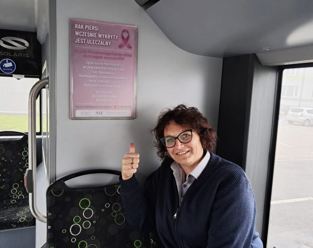 – Cieszę się, że takie informacje pojawiły się również w moim autobusie. Pamiętajmy, że profilaktyka ratuje życie. Mam nadzieję, że pasażerki, widząc ten plakat, także zdecydują się na mammografię i cytologię, że będzie to impuls do działania. Cieszę się, że mogę w ten sposób zachęcać kobiety do zadbania o siebie. W innych autobusach pojawiły się plakaty dotyczące profilaktyki zapobiegania rakowi jelita grubego, który wcześnie wykryty jest uleczalny. Mam nadzieję, że to również zachęci do działania i zapisania się na badania – mówi Monika Reszka, kierowca autobusu.