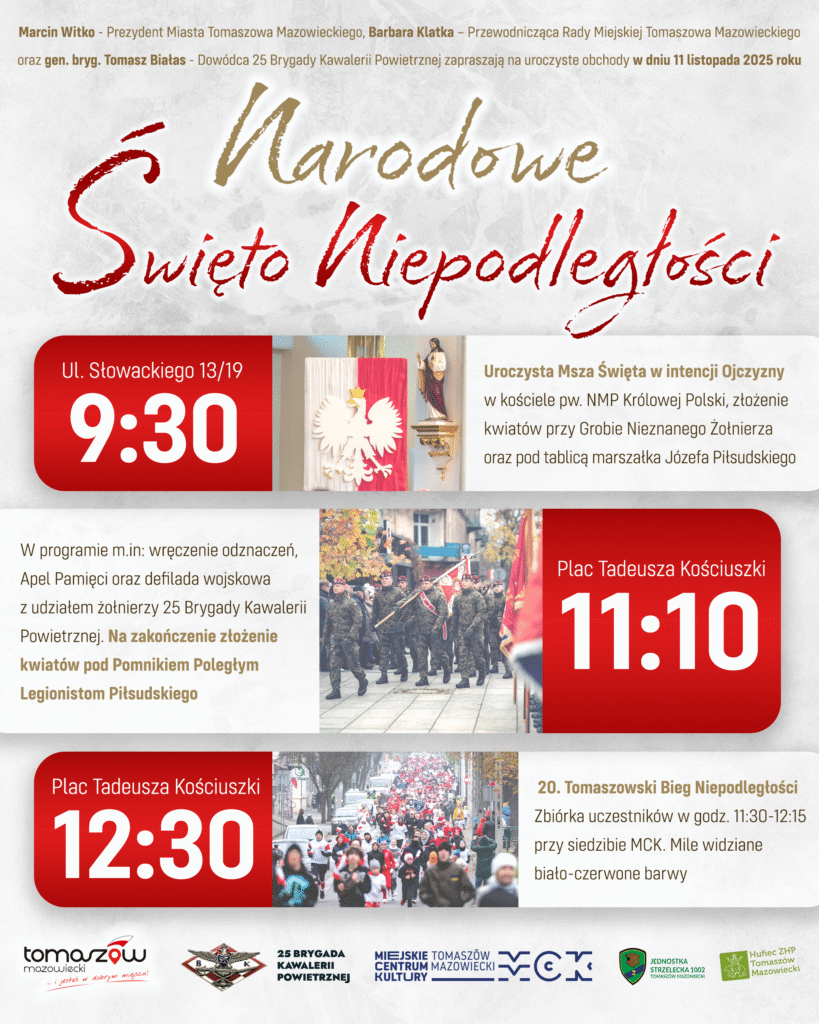 Marcin Witko – Prezydent Tomaszowa Mazowieckiego, Barbara Klatka – Przewodnicząca Rady Miejskiej Tomaszowa Mazowieckiego oraz gen. bryg. Tomasz Białas – Dowódca 25 Brygady Kawalerii Powietrznej zapraszają na uroczyste obchody Narodowego Święta Niepodległości.