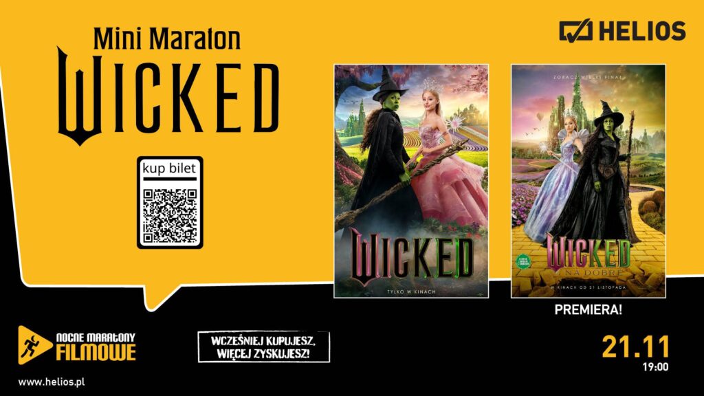 W piątek 21 listopada, kina Helios zapraszają na wyjątkową ucztę filmową, z dwiema częściami adaptacji bestsellerowej powieści Gregory’ego Maguire’a! Na początek „WICKED”, elektryzująca opowieść o historii czarownic z krainy Oz i wyjątkowej przyjaźni Elphaby i Glindy. Obie bohaterki są studentkami Uniwersytetu Shiz w fantastycznej Krainie Oz. Jednak po spotkaniu z Czarnoksiężnikiem przyjaźń stanie na rozdrożu, a życie obierze zupełnie inne ścieżki. Po krótkiej przerwie, na ekranach premierowo: „WICKED: NA DOBRE”! Mimo dzielącej je przepaści, Glinda i Elphaba będą musiały po raz ostatni się zjednoczyć. Ich niezwykła przyjaźń stanie się osią, od której zależy ich przyszłość. By odmienić siebie i całe Oz na dobre. Jesteśmy przekonani, że taka dawka emocji jeszcze długo po powrocie do domu nie pozwoli Wam zasnąć. Czy jesteście na to gotowi?