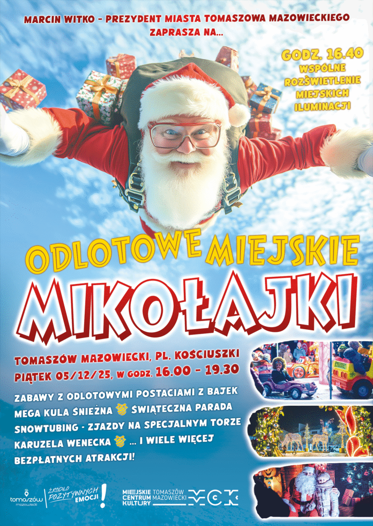 – 5 grudnia w godz. 16 -19.30, Plac Tadeusza Kościuszki – Odlotowe Miejskie Mikołajki. O godzinie 16.40 wspólne rozświetlenie miejskich iluminacji! Zabawy z odlotowymi postaciami z bajek, mega kula śnieżna, świąteczna parada, snowtubing – zjazdy na specjalnym torze, karuzela wenecka … i wiele, wiele więcej bezpłatnych atrakcji!