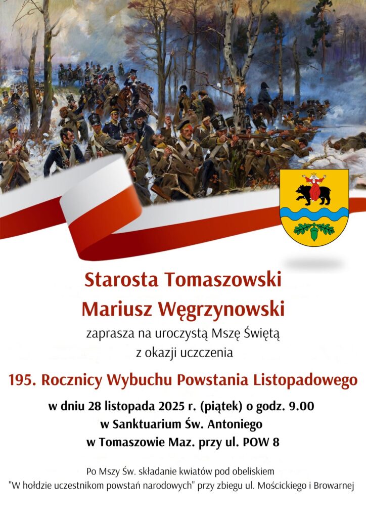 Starosta Powiatu Tomaszowskiego, zaprasza na uroczyste obchody 195. rocznicy wybuchu powstania listopadowego, które odbędą się w piątek, 28 listopada 2025 roku. O godzinie 9.00 w Sanktuarium św. Antoniego przy ulicy POW 8 w Tomaszowie Mazowieckim odprawiona zostanie uroczysta msza święta w intencji powstańców.