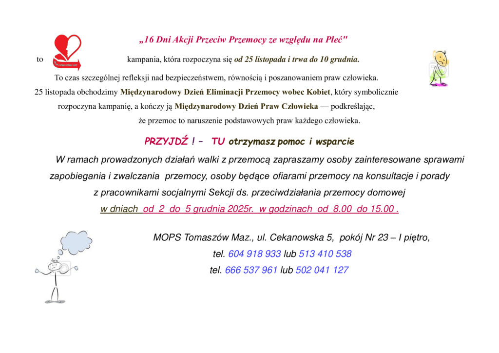 Każdy, kto potrzebuje wsparcia w tym zakresie może też liczyć na pomoc specjalistów. Od 2 do 5 grudnia radą służą pracownicy sekcji ds. przeciwdziałania przemocy domowej Miejskiego Ośrodka Pomocy Społecznej, których można odwiedzić w siedzibie instytucji między 8.00 a 15:00.
