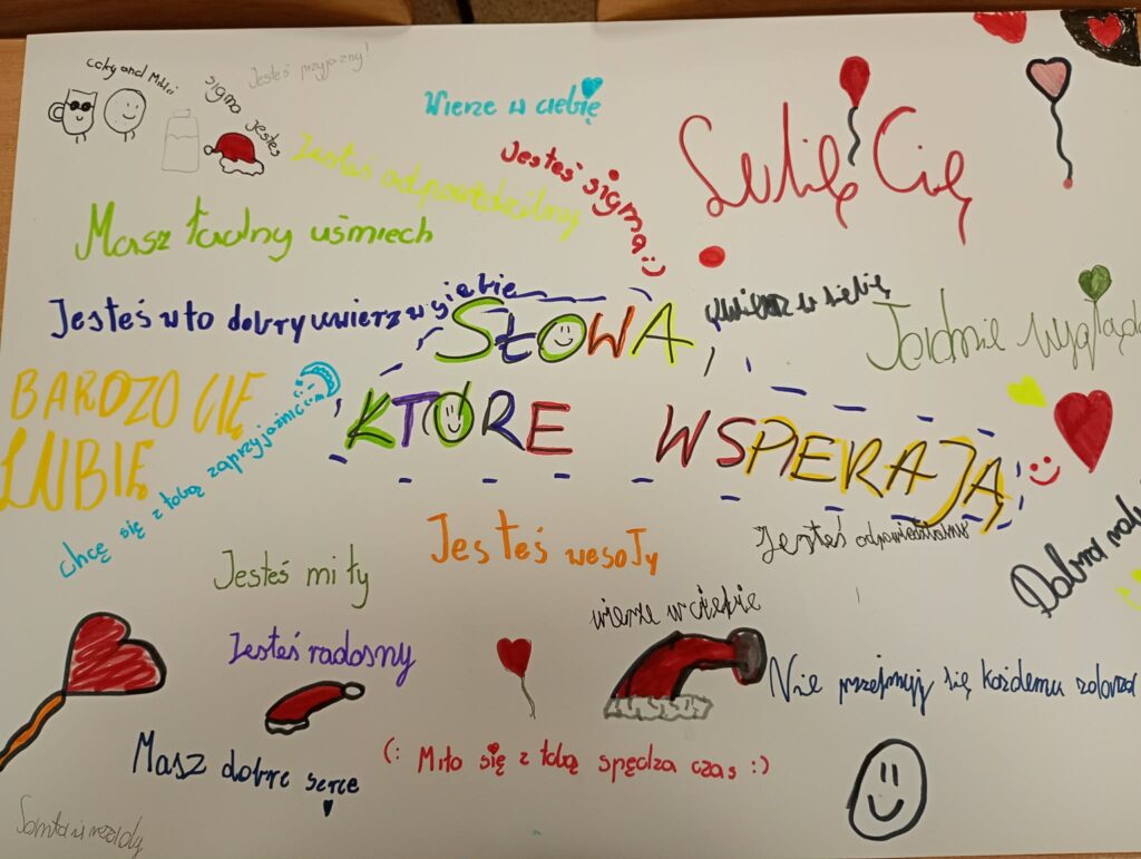 Dziś uczniowie klasy 4b wzięli udział w lekcji, na której uczyli się jak budować relacje w klasie, jak wspierać się dobrym słowem.