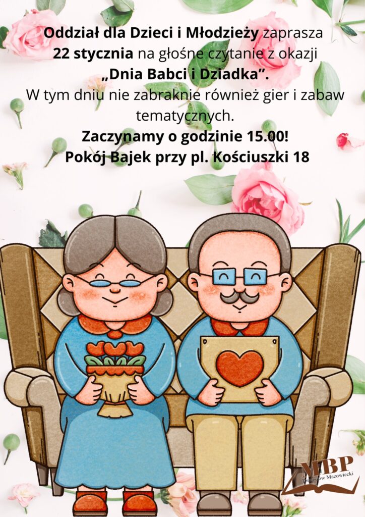 22 stycznia o godz. 15.00 w Oddziale dla Dzieci i Młodzieży MBP odbędzie się głośne czytanie z okazji Dnia Babci i Dziadka. Biblioteka zaprasza serdecznie najmłodszych czytelników do wspólnej zabawy, która odbędzie się w Pokoju Bajek przy Pl. Kościuszki 18.
