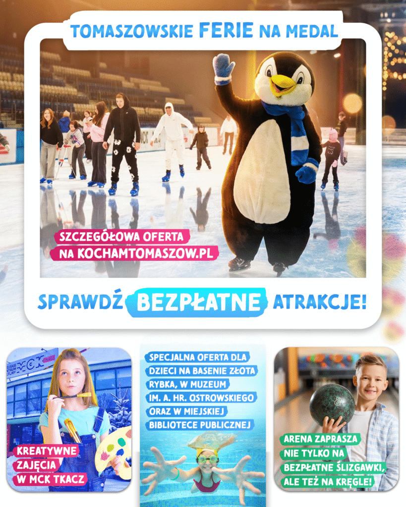 Wielkimi krokami zbliżają się Ferie Zimowe 2026, które potrwają od 2 do 15 lutego. Miejskie instytucje kultury i placówki oświatowe przygotowały mnóstwo atrakcji na tegoroczne ferie zimowe. Nie zabraknie również bezpłatnych atrakcji, m.in. wejść na ślizgawkę na Arenie Lodowej i na basen, do Miejskiego Centrum Kultury, Biblioteki i Muzeum. Sprawdźcie, jak spędzić zimowe ferie w Tomaszowie Mazowieckim.