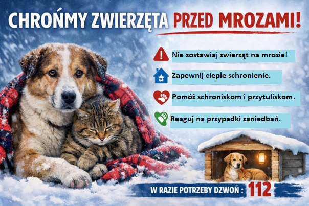 Niskie temperatury stanowią zagrożenie dla zdrowia i życia zwierząt, w szczególności zwierząt bezdomnych, gospodarskich oraz domowych przebywających na zewnątrz.