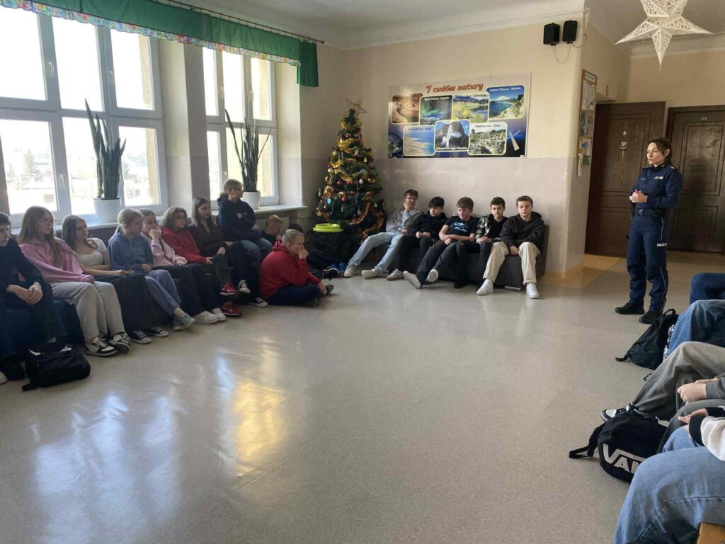 W czwartek uczniowie klas 7 i 8 uczestniczyli w spotkaniu z policjantką poświęconym odpowiedzialności prawnej nieletnich. Rozmawialiśmy o przemocy, hejcie w szkole i w sieci, publikowaniu czyjegoś wizerunku bez zgody, zakładaniu fałszywych kont z użyciem cudzych zdjęć, a także o używaniu wulgaryzmów i obrażaniu innych na grupach klasowych.