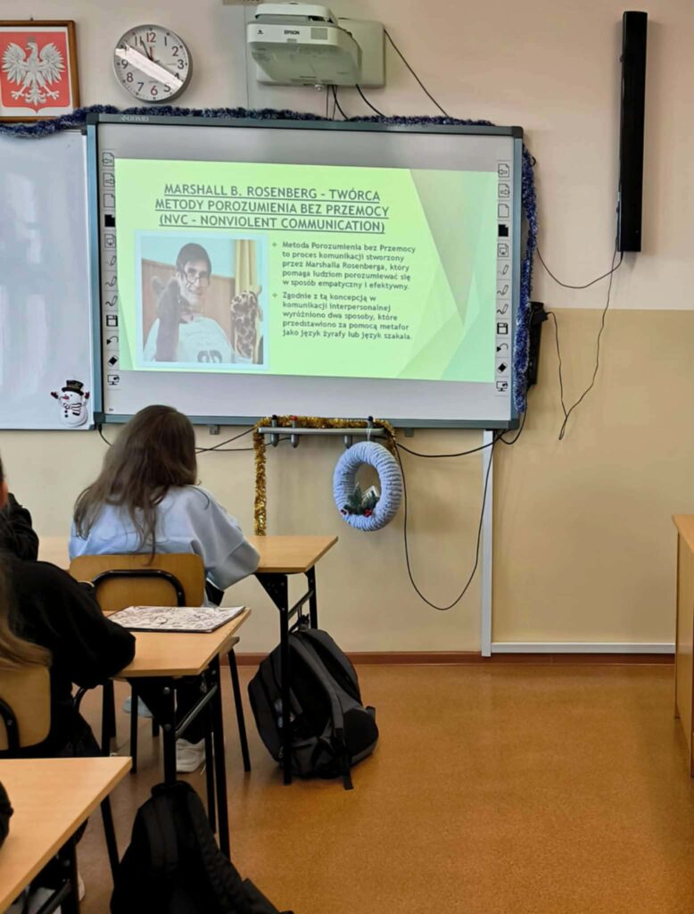 Uczniowie klasy 8a wzięli udział w lekcji profilaktycznej, której tematem była komunikacja według metody Porozumienia Bez Przemocy autorstwa Marshalla B. Rosenberga.