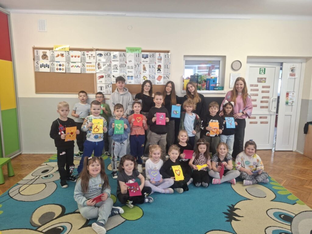 Z okazji Dnia Świętego Walentego uczniowie klasy 8a wraz z przedszkolnym nauczycielem języka angielskiego odwiedzili przedszkolaków, aby wspólnie świętować Valentine’s Day. Było to spotkanie pełne uśmiechu, życzliwości i dobrej energii. Podczas wizyty dzieci wysłuchały opowiadania pt. „Miłość”, wspólnie nauczyły się angielskiej piosenki „Heart”, ćwicząc przy tym literowanie w języku angielskim, a także przygotowały piękne kartki walentynkowe dla swoich rodziców. Starsi uczniowie pokazali, że nauka w szkole może być równie radosna i inspirująca jak czas spędzony w przedszkolu. Takie spotkania budują relacje, uczą współpracy i pokazują, że razem możemy więcej. Współpraca na linii SP9 i P5 to zdecydowanie współpraca na piątkę!