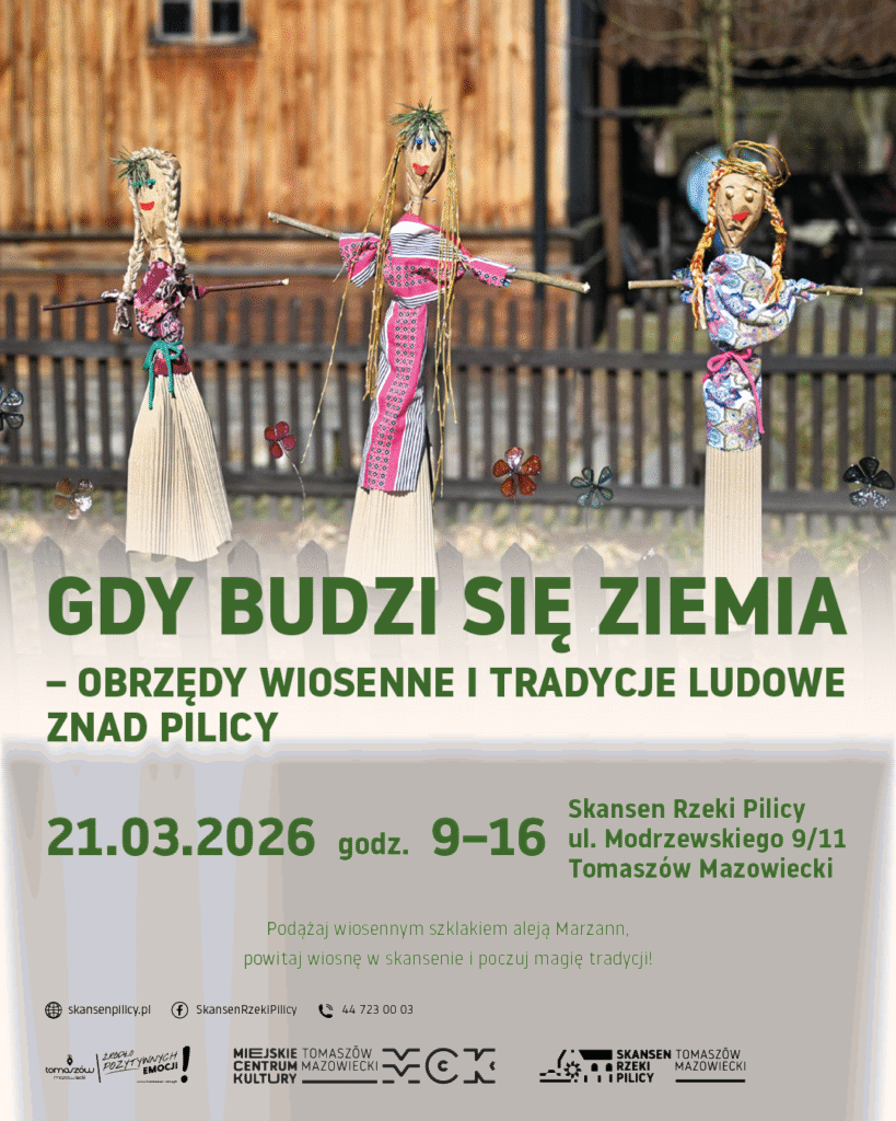 21 marca 2026 r. w godzinach 9:00–16:00 w Skansenie Rzeki Pilicy w Tomaszowie Mazowieckim odbędzie się wydarzenie pt. „Gdy budzi się ziemia – obrzędy wiosenne i tradycje ludowe znad Pilicy” , czyli Powitanie wiosny w Skansenie Rzeki Pilicy. Wydarzenie będzie okazją do zapoznania się z wybranymi ludowymi zwyczajami wiosennymi regionu nadpilickiego oraz prezentacją tradycji związanych z symboliką Marzanny.