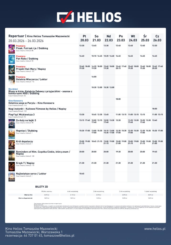 Innym pomysłem na rodzinny seans będzie polski tytuł „Za duży na bajki 3”. W trzeciej części Waldek musi zmierzyć się z konsekwencjami własnego błędu: jego z pozoru niewinny internetowy komentarz uruchamia falę nienawiści, która uderza w jego przyjaciółkę, Delfinę. Chłopak staje przed trudnym wyzwaniem i musi zdobyć się na odwagę, by przyznać się do winy i naprawić sytuację. Helios przygotował również seanse dla najmłodszych z popularną bajką. Seanse „Bluey w kinie: Kolekcja Zabawy z przyjaciółmi” zawitają do kin w sobotę i niedzielę, 21 i 22 marca, a będą towarzyszyć im konkursy dla dzieci.