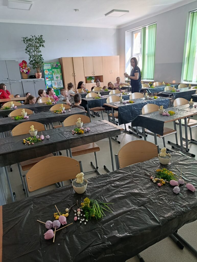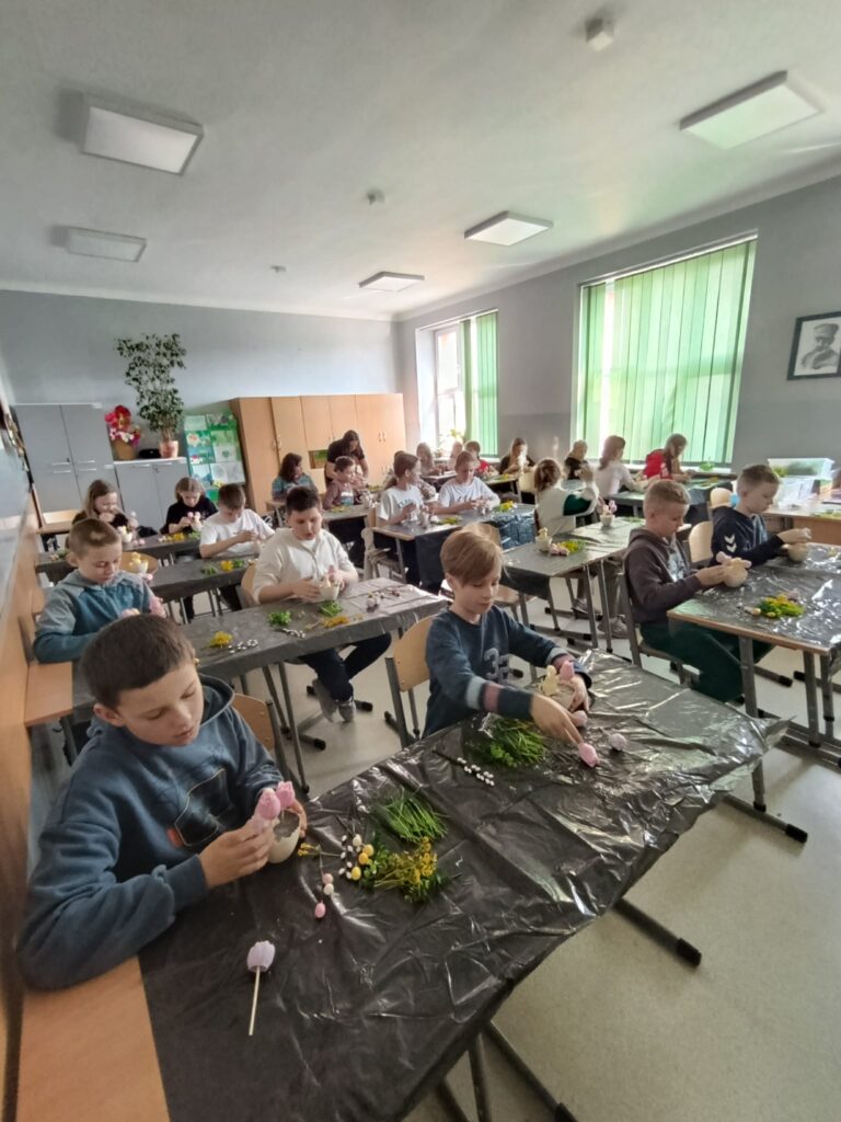 Każdy uczeń z wielkim zaangażowaniem wykonał z otrzymanych materiałów świąteczny stroik, którym ozdobi wielkanocny stół.