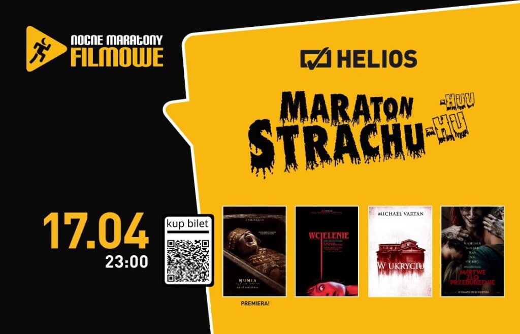 Już 17 kwietnia, kina Helios zapraszają na noc z czterema przerażającymi horrorami, po obejrzeniu których będziecie mieli obawy przed zgaszeniem światła nawet we własnym domu. Zaczniemy wyczekiwaną premierą filmu „MUMIA: FILM LEE CRONINA”. Chwilę potem, mrożący krew w żyłach „WCIELENIE”. Dla tych, którym wystarczy jeszcze odwagi, dwa kolejne, świetnie oceniane horrory – „W UKRYCIU” i na zakończenie „MARTWE ZŁO: PRZEBUDZENIE”.